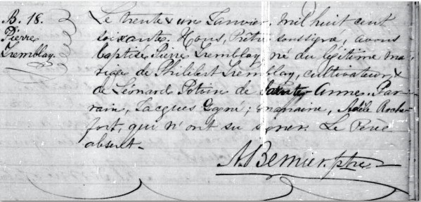 Acte de baptême de Pierre Tremblay le 31 janvier 1860 à Saint-François-Xavier, Chicoutimi (Source: Généalogie Québec)
