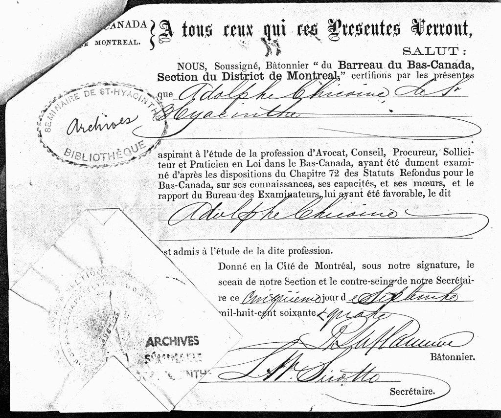[i] Centre d’histoire de Saint-Hyacinthe, Fonds Jérôme-Adolphe Chicoyne : CH008/000/000/016/026 : Certificat attestant l’admission de Jérôme-Adolphe Chicoyne à l’étude de la profession d’avocat.