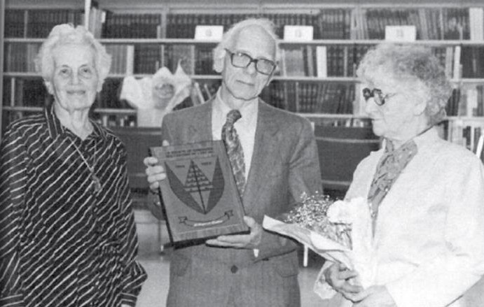 Dimanche 29 avril 1984. Monsieur Raymond Lambert reçoit le titre de Membre émérite de la Société de généalogie des Cantons-de-l’Est. À gauche, Madame Marthe Faribault-Beauregard de la Société généalogique canadienne française de Montréal et à droite, Madame Christiane Vallières, son épouse.