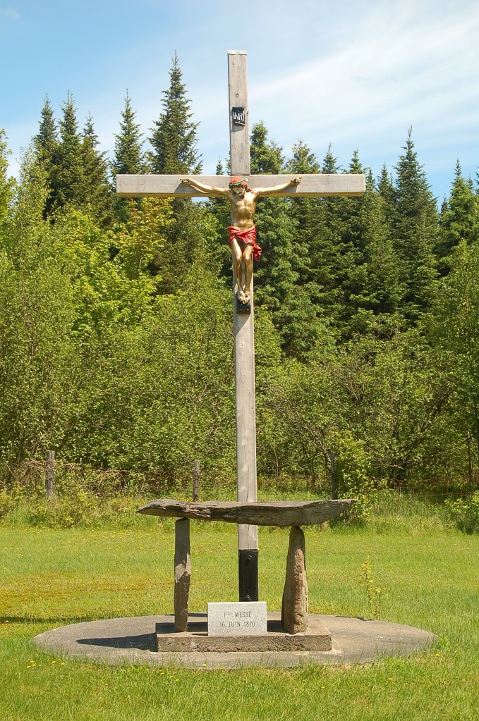 J.A. Chicoyne écrivit : Le lendemain matin, 15 juin, nous nous levâmes au premier chant du coq, et au bout d’une couple d’heures nous étions rendus à la mine d’or de M. Pope, située à peu près sur le lot 40 du 9ème rang de Ditton. Nous étions rendus sur les confins de la civilisation. Le chemin est carrossable jusque là[ii]. Les explorateurs avaient parcouru une quinzaine de kilomètres, de l’hôtel à la mine d’or. Ils s’y reposèrent, prirent une bouchée et repartirent à pied, les chevaux ayant été mis dans un pâturage jusqu’à leur retour. Vers 10 heures, ils atteignirent la ligne de division entre les cantons de Ditton et d’Emberton. À l’annexe 2 du livre, nous retrouverons une carte des deux cantons. L’arpenteur Lippé ouvrit la marche et plaqua le chemin jusqu’au tracé du chemin Verchères. Après avoir atteint les bords d’une petite rivière, ils montèrent leur campement pour la nuit, plantèrent une croix et érigèrent une table d’autel sur laquelle, le lendemain, le 16 juin, jour de la Fête Dieu, le curé J.B. Chartier dit la première messe dans le canton d’Emberton, à l’endroit où le futur village de Chartierville sera érigé.