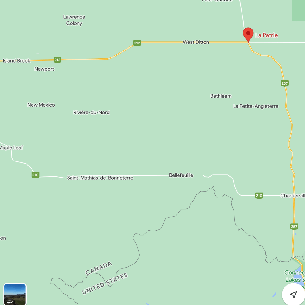 Carte des environs de La Patrie de nos jours qui garde encore des éléments de toponymie du 19e siècle mentionnés dans l’article. Source: Google.
