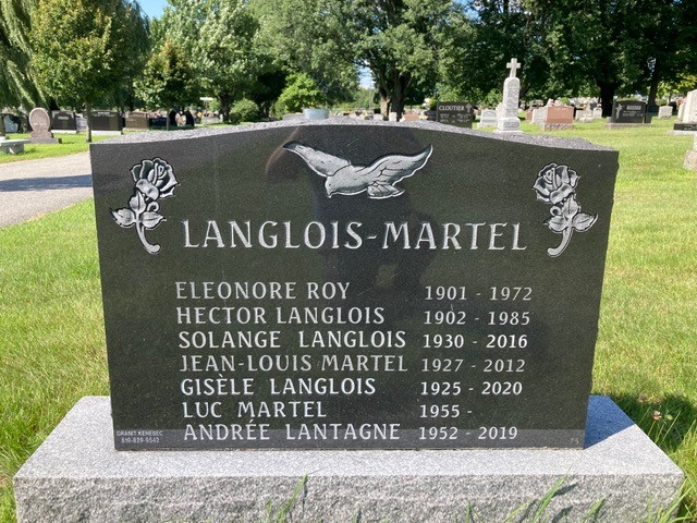 Pierre tombale de la famille Langlois-Martel au cimetière Saint-Michel de Sherbrooke. Gisèle Langlois-Martel (1925-2020) et son époux Jean-Louis Martel (1927-2012). Photo: L’Entraide numérique.
