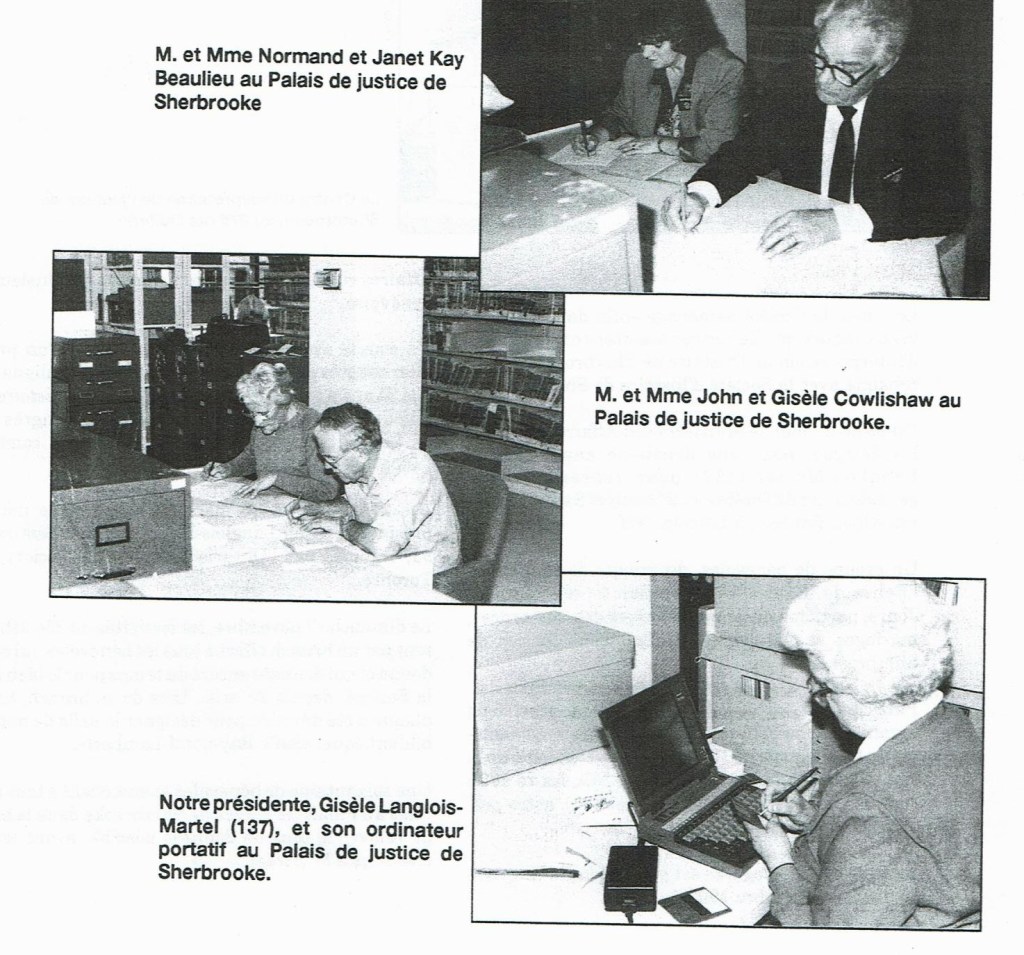 La prochaine série d’images, extraite du programme-souvenir du Congrès du 25e anniversaire (page 39), rend compte de travail significatif des membres à documenter les registres paroissiaux de la région au Palais de Justice de Sherbrooke avant que ces dossiers précieux pour notre généalogie régionale ne prennent la route de Québec ou de Montréal. Parmi les bénévoles, un groupe de secours de l’Église des Jésus-Christ des Saints des Derniers Jours, participe au projet de relevé des naissances, mariages et sépultures du Palais de Justice de Sherbrooke.