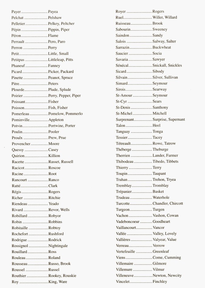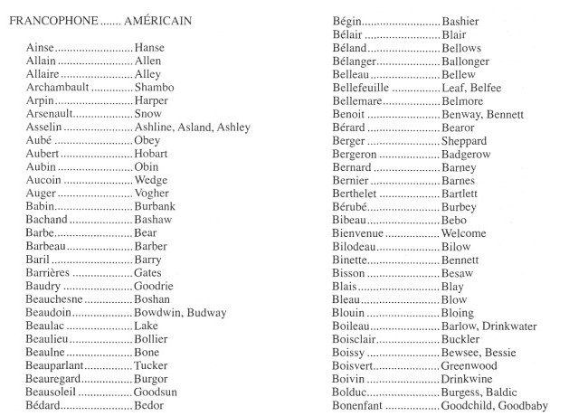 Le deuxième type est la prononciation à l’anglaise du nom francophone, tel Bone pour Beaulne, Bashaw pour Bachand, Willet pour Ouellet. De fait, la traduction est généralement assez évidente qu’avec un peu d’imagination, on peut facilement deviner le terme anglais. Par exemple, il ne faut pas être très malin pour penser qu’un Lévesque deviendra un Bishop, un Dupont deviendra un Bridge, un Fontaine deviendra un Spring, un Bleau deviendra un Blow, ou un Rocheleau deviendra un Rushlow. À vous de deviner ce qu’est devenu votre nom de famille de l’autre côté de la frontière.