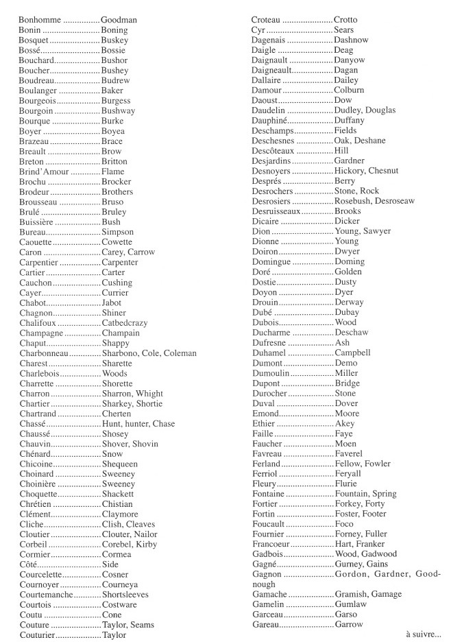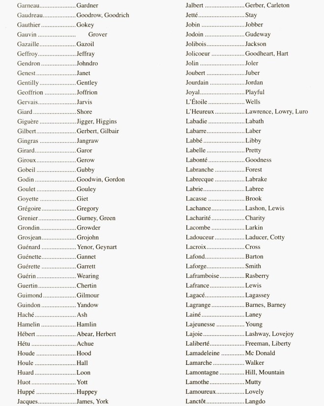 Vous verrez que l’américanisation des noms est principalement de deux types : soit la traduction littérale du nom, tel Baker pour Boulanger, Greenwood pour Boisvert, King pour Roy, Shortsleeves pour Courtemanche. Certains sont parfois cocasses, comme Catbedcrazy pour Chalifoux.