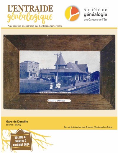 Terminons ce premier de deux articles avec notre propre revue de la Société de généalogie des Cantons-de-l’Est (SGCE) – L’Entraide généalogique – et son numéro de l’automne qui offre en première page une photo historique de la gare de Danville qui illustre l’article sur l’arrivée de la famille Bruneau en Estrie et l’histoire de cette descendance à l’occasion du 150e anniversaire de cette arrivée qui remonte à 1874. L’article est écrit par Pierre Bruneau, l’un des doyens parmi les membres de notre Société de généalogie.