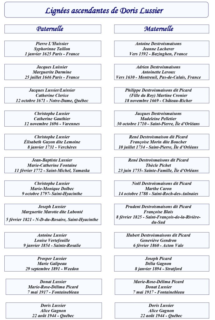 Doris Lussier est né à Fontainebleau le 15 juillet 1918. Il était le fils de Donat Lussier et de Marie-Rose-Délima Picard. Son père est décédé le 19 février 1922 à l’âge de 26 ans. Il était né le 11 octobre 1896 à Weedon. Alors orphelin de père, Doris trouva le moyen de s’instruire et de se cultiver.