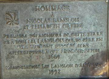 Plaque commémorative installée sur la terre ancestrale de Nicolas Langlois par l’Association des Langlois d’Amérique en 1992 : ‘’Hommage à Nicolas Langlois et Élisabeth Cretel, premiers défricheurs de cette terre et à tous les Langlois qui, de père en fils, leur ont succédé sans interruption, à cet endroit depuis 1669’’.