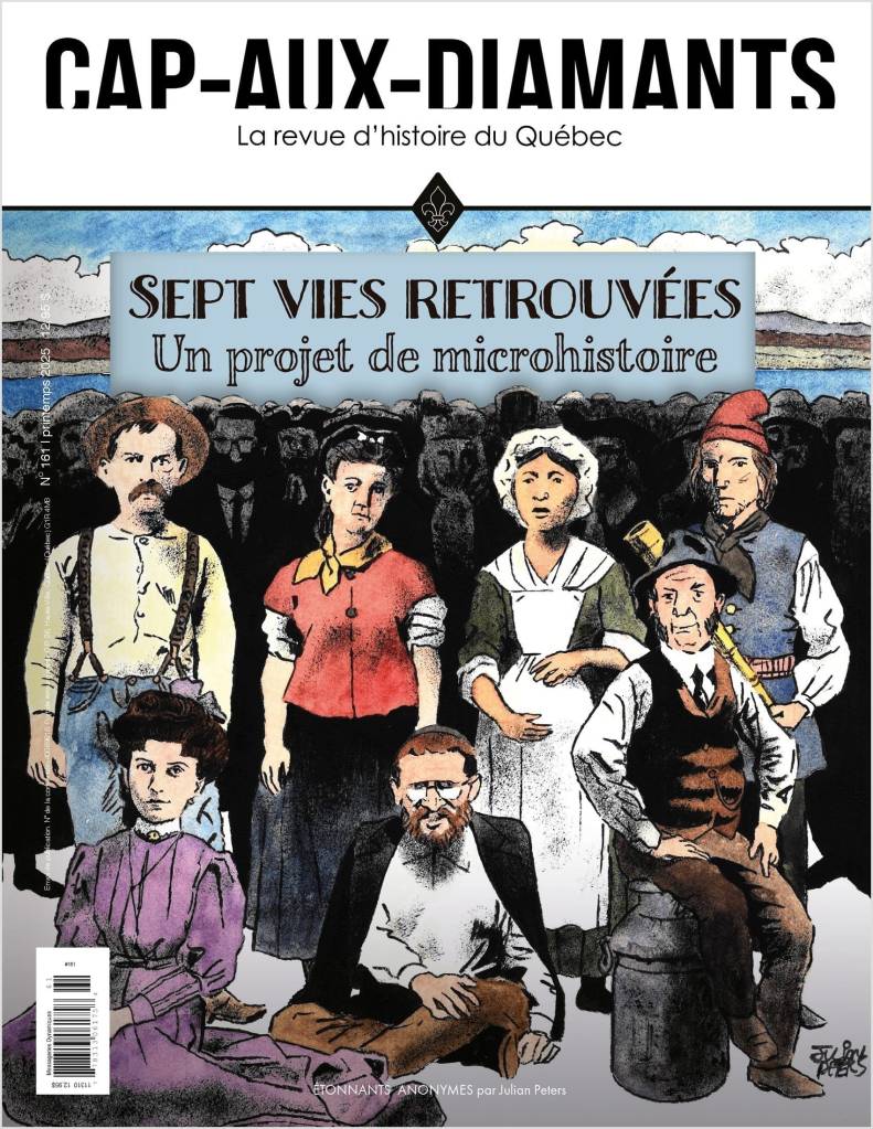 La revue Cap-Aux-Diamants propose un projet de microhistoire pour son numéro du printemps 2025. Intitulé « Sept vies retrouvées – Un projet de microhistoire », sa page couverture avec cette œuvre du bédéiste Julian Peters illustre son concept.